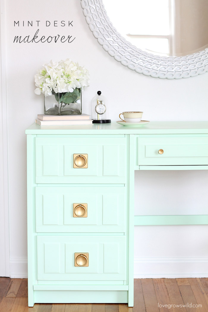 DIY desk painted with a muted mint green and new gold hardware