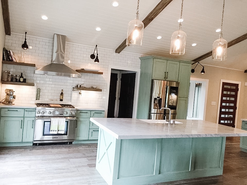Homeowners asked for a contemporary farmhouse style. Modern horizontal lines were mixed with concrete, distressed wood, painted cabinets with an antique glaze, and honed marble countertops.