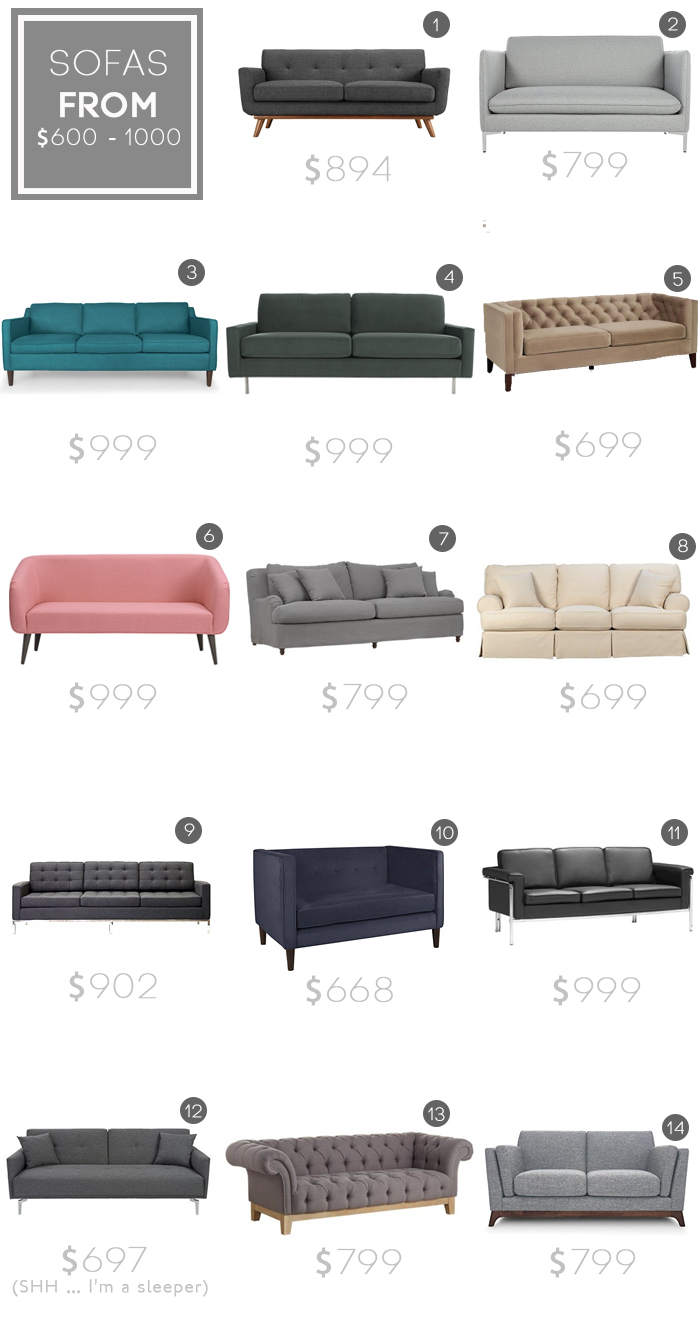 She has a great break down with links to some online retailers with prices between $300-$600 and $600-$1000. My recommendation for buying sofas especially if you have children is look for QUALITY. Look for heavy, solid furnishings constructed with kiln-dried hardwood that's been screwed, glued and corner-blocked. Make sure upholstered pieces have eight-way ties. Upgrade cushions to spring down, which does an excellent job of holding its shape. These pieces will stand up to years of abuse and can be reupholstered once your children reach a more civilized age. Most piece with this kind of quality are out of a lot of families budgets. A great source is vintage furniture that can be reupholstered.