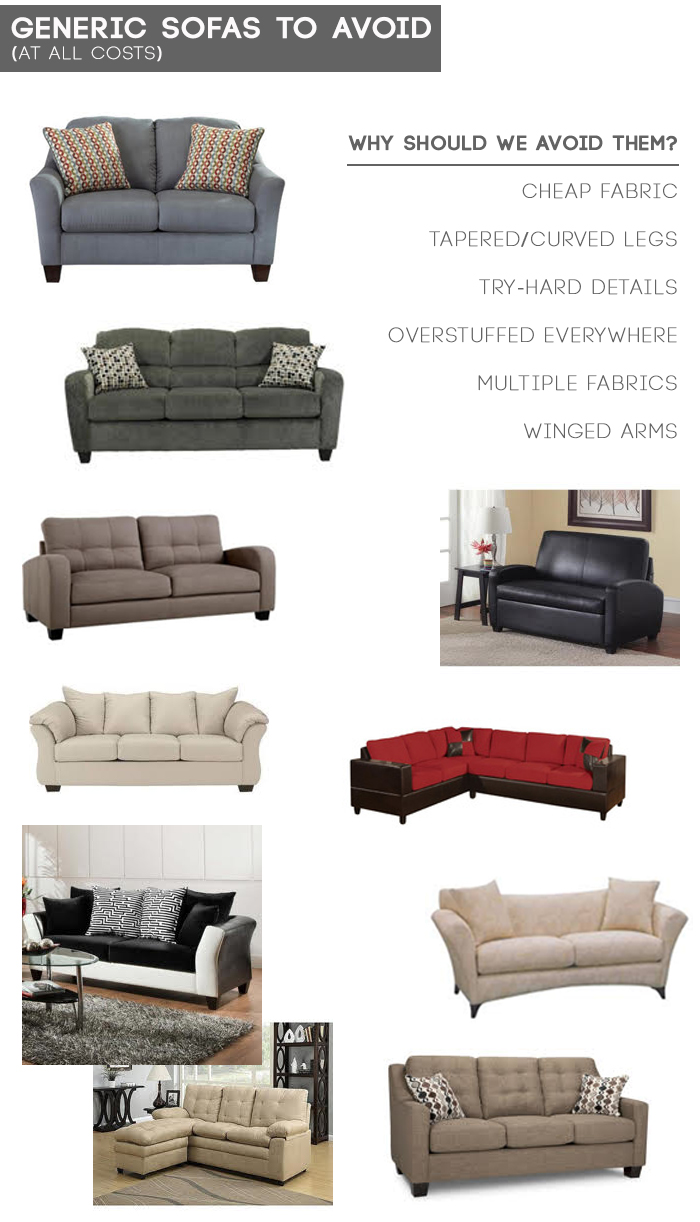 Emily Henderson with Style By Emily Henderson wrote an informative post on sofas, and choosing affordable ones that are easy to stylize and fit with great design. Basically you do not want to choose anything that is overly stuffed or has arms that are too tapered. Most furniture store near you carry a large assortment of these types of sofas, so it’s hard to find something that is simpler and will fit into a designed space more seamlessly. Here are some of the sofa styles to avoid.